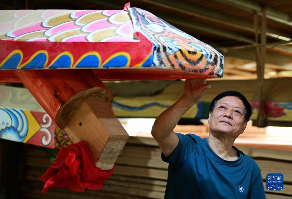 在福州市闽侯县方庄村“龙舟世家”方忠雄龙舟厂,福州市非物质文化遗产“方庄龙舟制造技艺(闽侯县)”传承人方绍晃在查看传统龙舟(5月23日摄)。