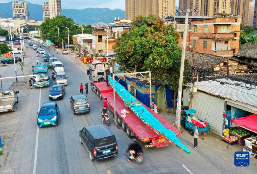 在福州市闽侯县方庄村,一艘完工的龙舟正在装车(6月12日摄,无人机照片)。