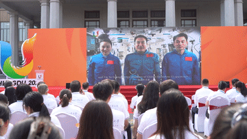 在哈尔滨站火炬传递的起跑仪式中,哈工大100名学生参与了开场秀表演。