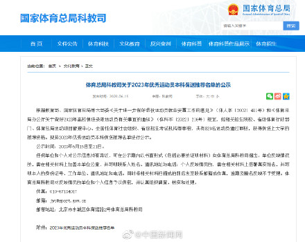 6月15日,国家体育总局科教司发布关于2023年优秀运动员本科保送推荐名单的公示,公示时间为2023年6月15日至21日。名单显示,单板滑雪运动员苏翊鸣保送推荐清华大学。(体育总局科教司)