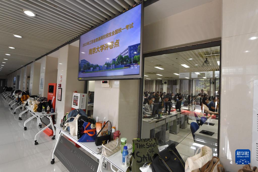 6月15日,阅卷教师在南京大学阅卷点认真评卷,随身物品放在教室外。