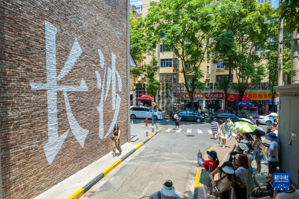6月7日,在位于长沙市芙蓉区的湖南米粉街,游客正在一面印有“长沙”字样的砖墙下打卡拍照(无人机照片)。