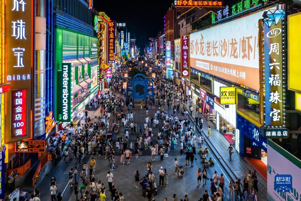 6月7日,游客在长沙市天心区黄兴路步行街游玩(无人机照片)。