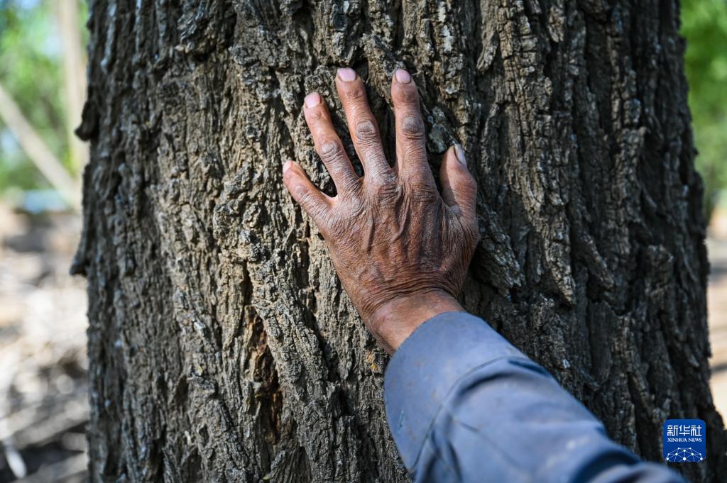 6月14日,曹扎娃抚摸一棵他亲手种下的榆树。