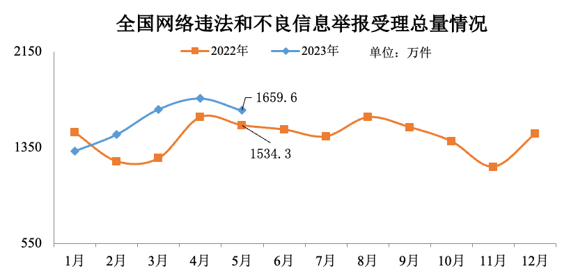 中央网信办举报中心近日公布的统计数据显示,2023年5月,中央网信办举报中心指导全国各级网信举报工作部门、主要网站平台受理网民举报色情、赌博、侵权、谣言等违法和不良信息1659.6万件,环比下降5.8%、同比增长8.2%。
