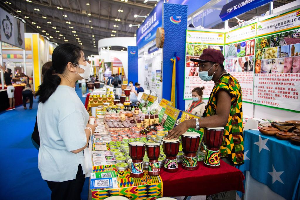 在长沙国际会展中心举办的第二届中国-非洲经贸博览会上,观众(左)在选购非洲护肤品(2021年9月28日摄)。新华社记者陈思汗 摄