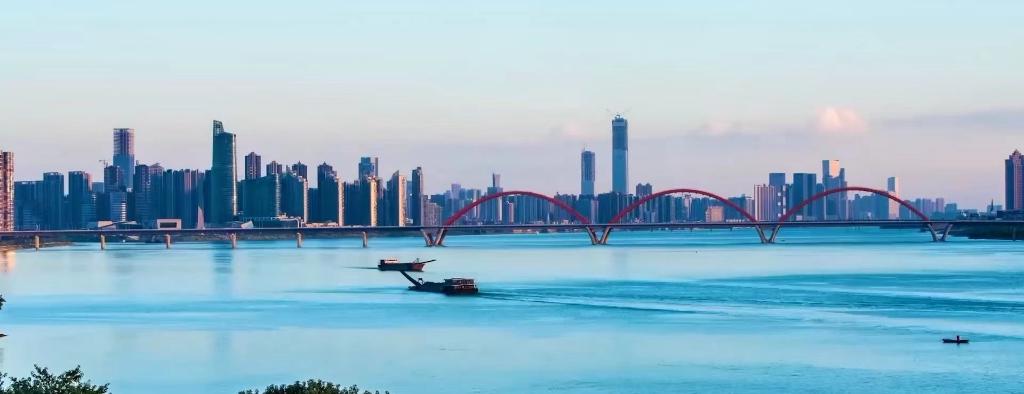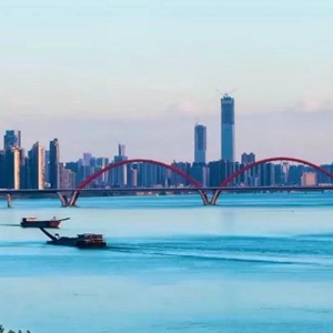 它北接洞庭,西屏岳麓,有江水穿城而过,橘子洲浮碧江心。