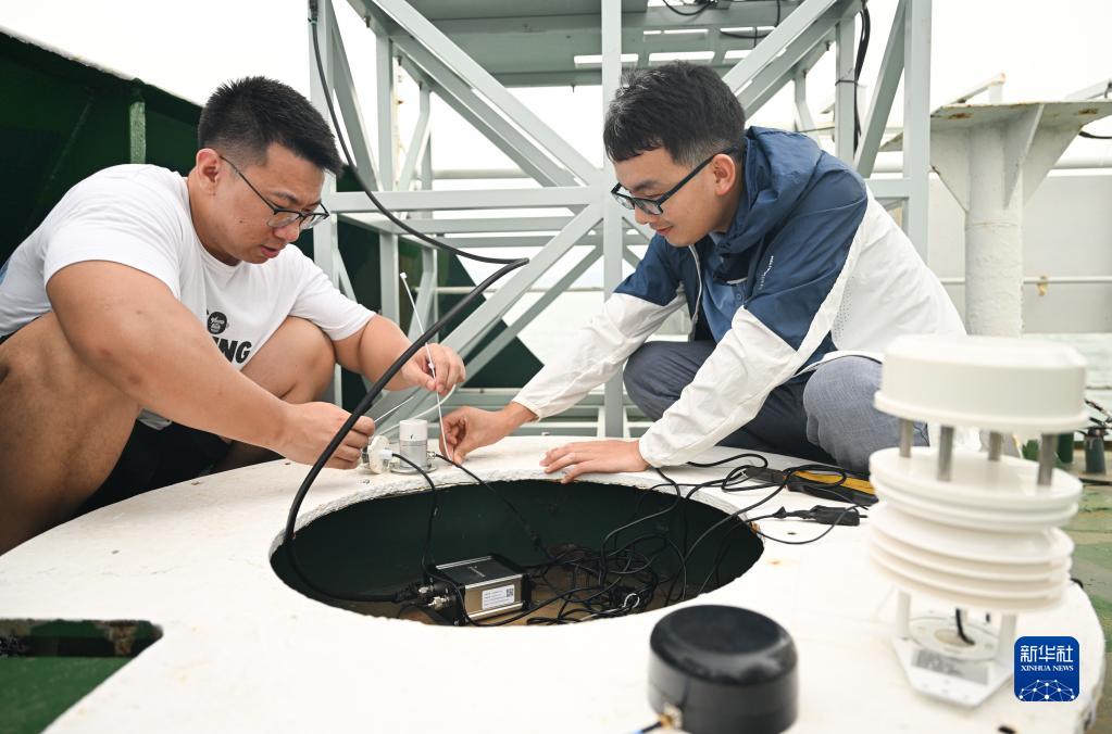 测试开始前,工作人员在“电科1号”综合试验船上安装传感器(6月14日摄)。