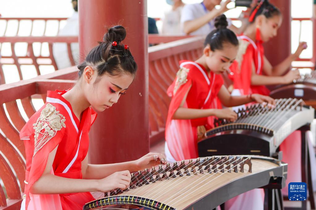 6月17日,在第十九届多浪龟兹文化旅游节现场,小朋友在表演古筝弹奏。
