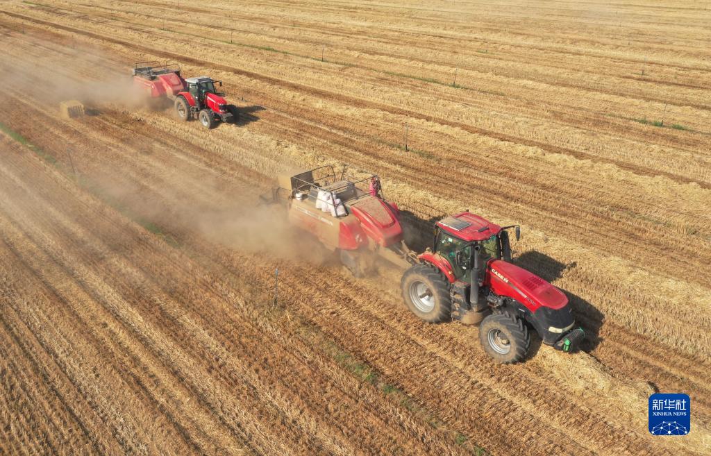 6月17日,河北邢台南和区阎里乡大郝村农民驾驶秸秆打捆机回收小麦秸秆(无人机照片)。