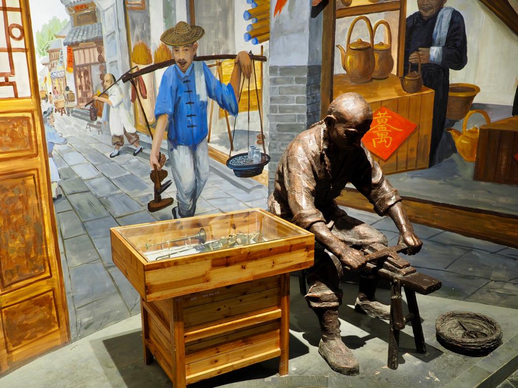 这是中国运河招幌博物馆内的雕塑,再现了运河岸边街头商贩磨刀的场景。新华社记者高天 摄