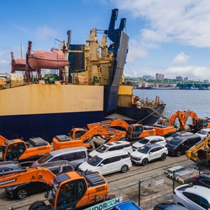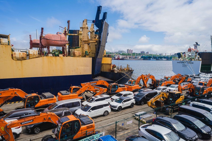 这是2022年6月16日在俄罗斯符拉迪沃斯托克港口拍摄的从货轮上卸下来的日本二手车。新华社发(郭飞洲摄)