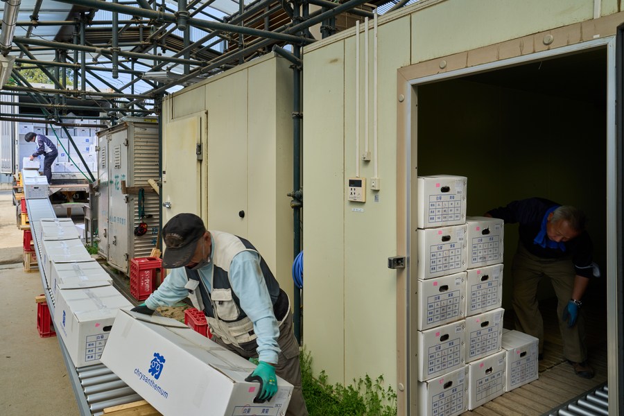 4月5日在日本埼玉县埼玉市的园艺中心,经营花卉公司的小西武(左)和工人将从中国云南进口的鲜花运进仓库。新华社记者张笑宇摄
