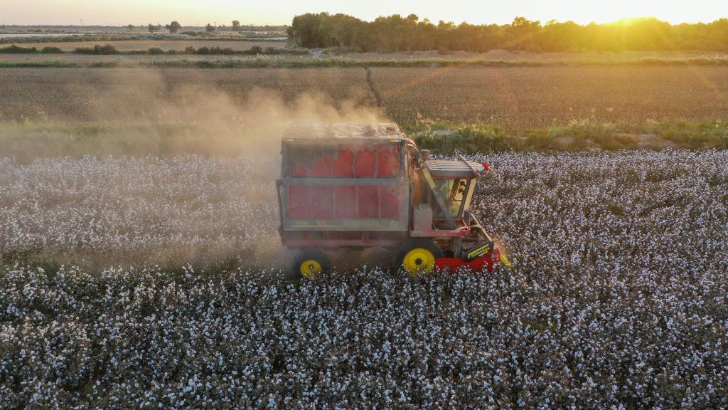 2022年9月26日,新疆沙雅县塔里木乡其格格热木村村民驾驶采棉机采收棉花(无人机照片)。新华社发(柳玉柱 摄)