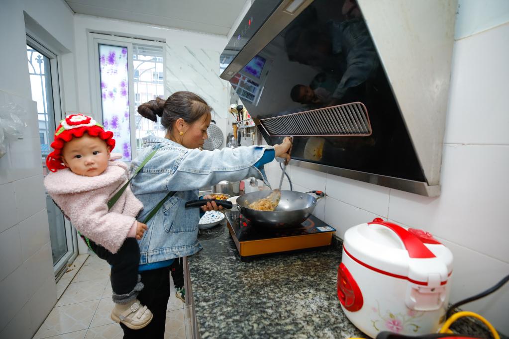 2022年10月28日,在四川省凉山州越西县越城镇城北感恩社区,易地扶贫搬迁到此的居民沙马石各在配备了现代化炊具的厨房里准备晚餐。搬进楼房的沙马石各再不用在传统的火塘边做饭,生活条件有了很大改善。新华社记者 沈伯韩 摄