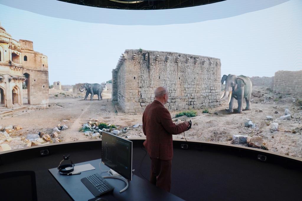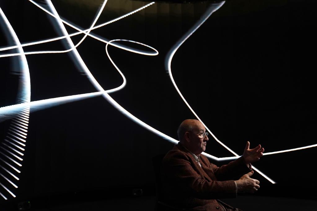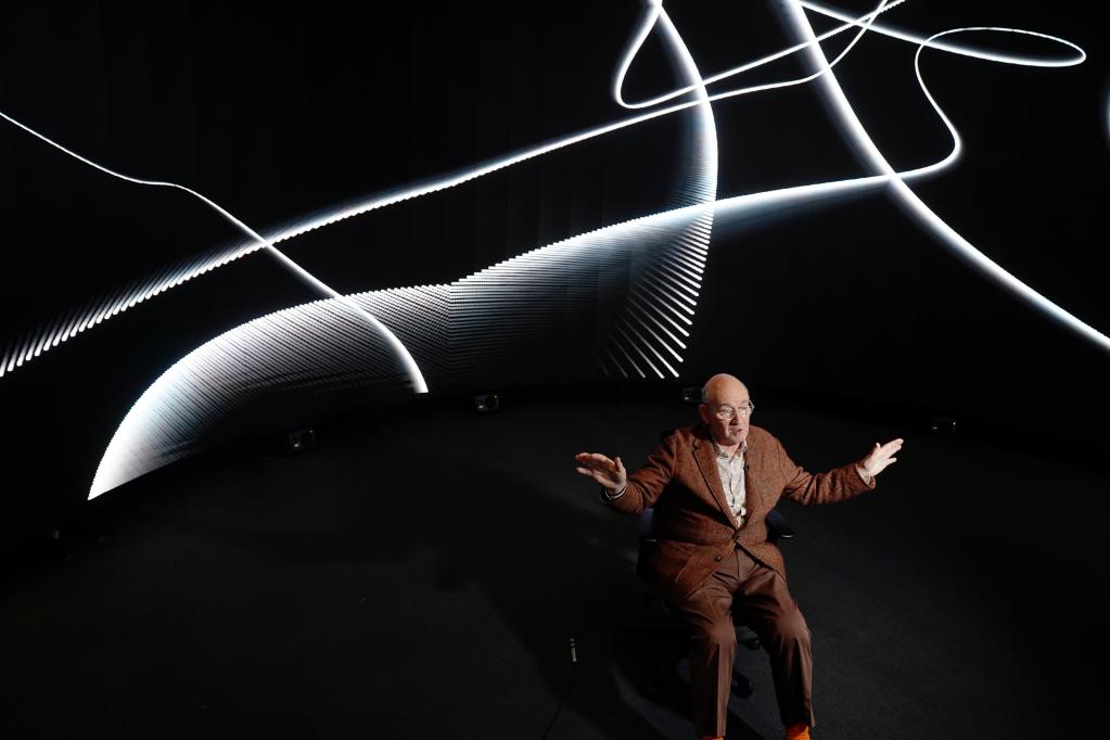 在香港浸会大学视觉化研究中心,香港浸会大学视觉艺术院讲座教授、艺术家邵志飞在配备有传感器和生物识别技术的全景影院中展示作品(5月11日摄)。新华社记者 王申 摄