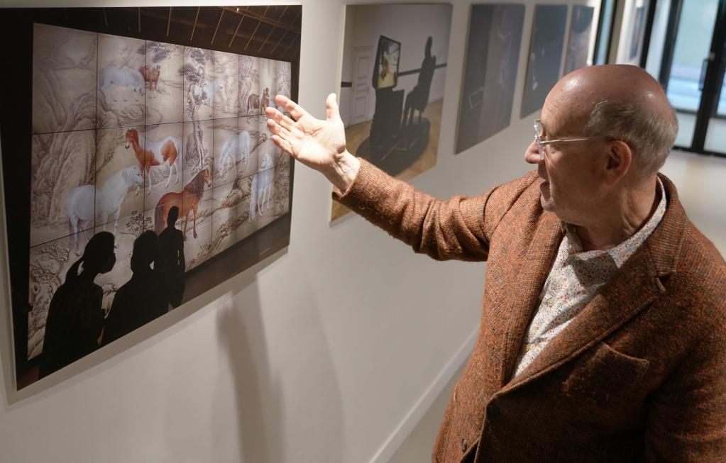 在香港浸会大学视觉化研究中心,香港浸会大学视觉艺术院讲座教授、艺术家邵志飞在讲解自己的作品(5月11日摄)。新华社记者 王申 摄