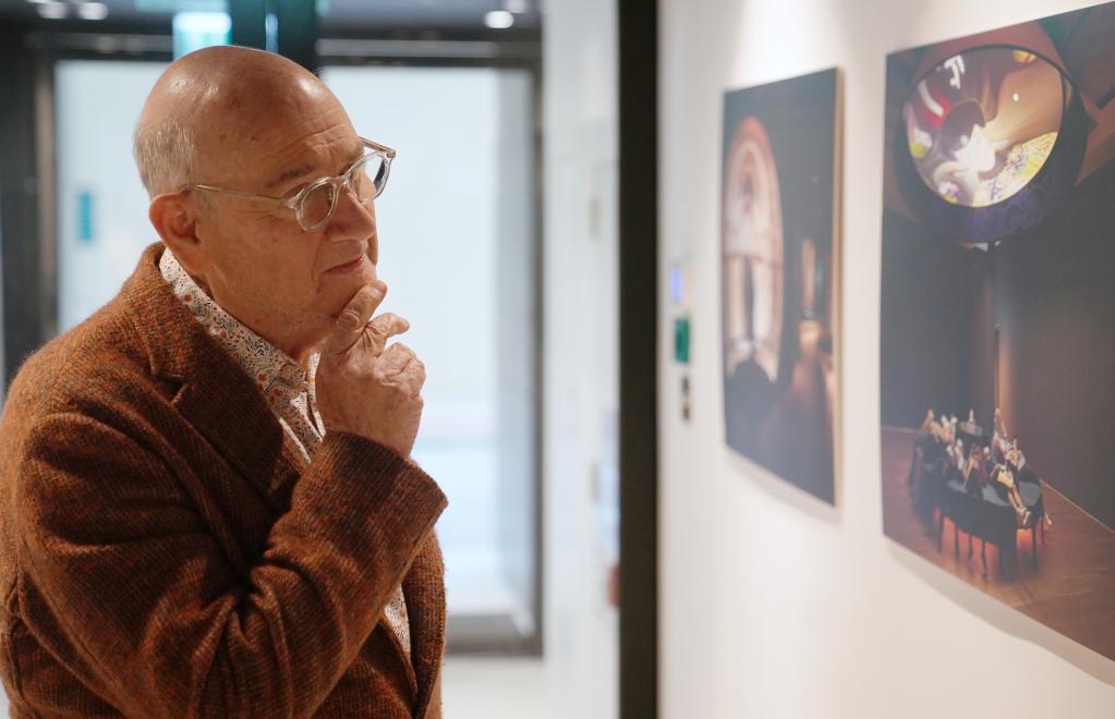 在香港浸会大学视觉化研究中心,香港浸会大学视觉艺术院讲座教授、艺术家邵志飞在自己的作品前驻足(5月11日摄)。新华社记者 王申 摄