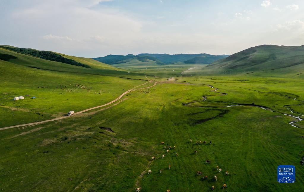 6月16日,额尔敦巴特尔一家赶着牛群行走在迁徙路上(无人机照片)。