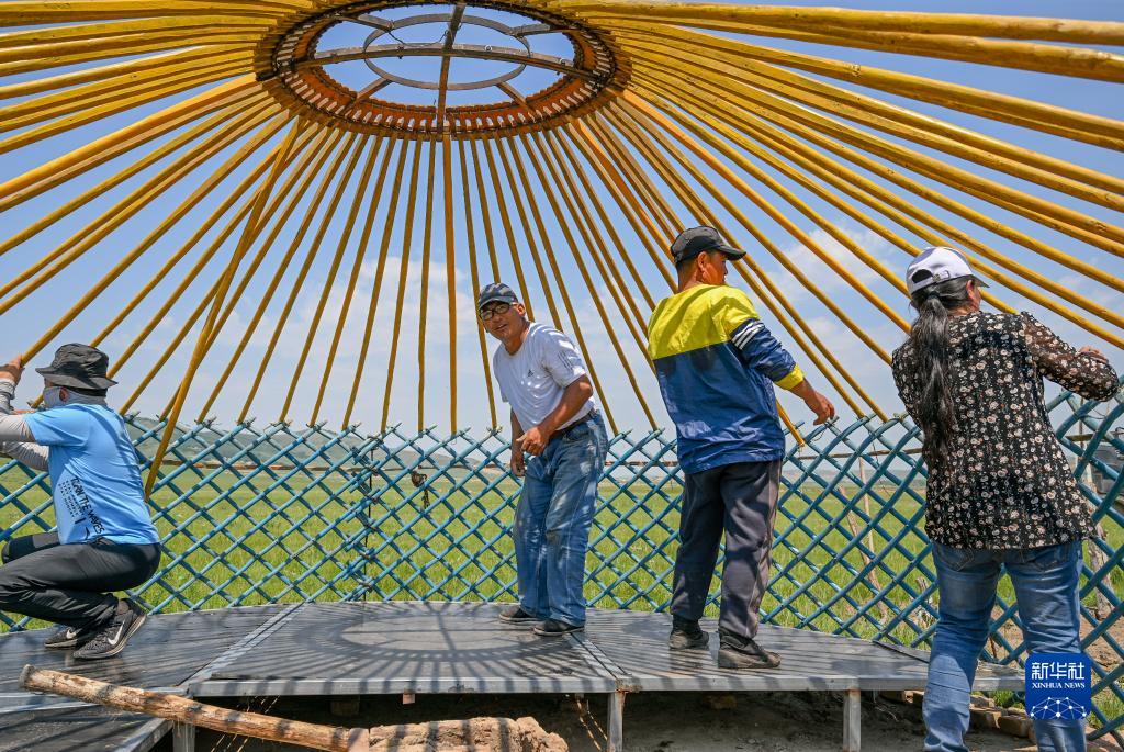 6月17日,额尔敦巴特尔一家在周围牧民的帮助下搭建毡房。