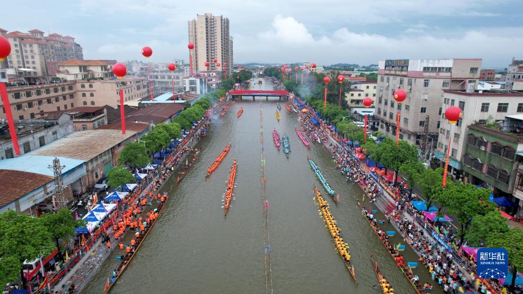 6月18日,龙舟队在广东省肇庆市高要区金利镇西围涌参赛(无人机照片)。