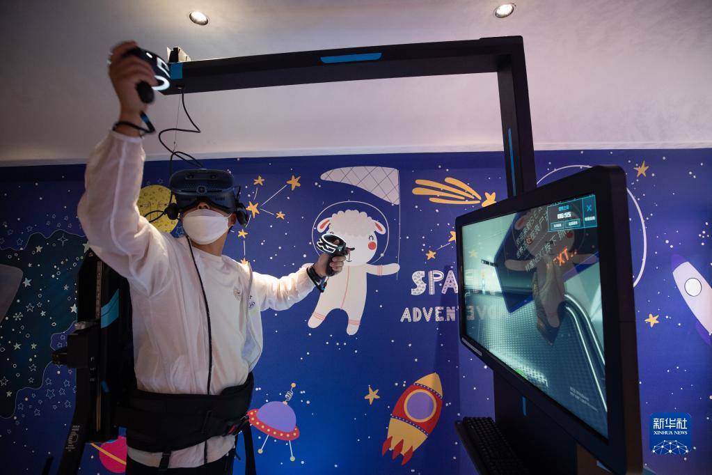 6月18日,在“林都号”旅游列车儿童游乐室内,乘客体验游戏设备。