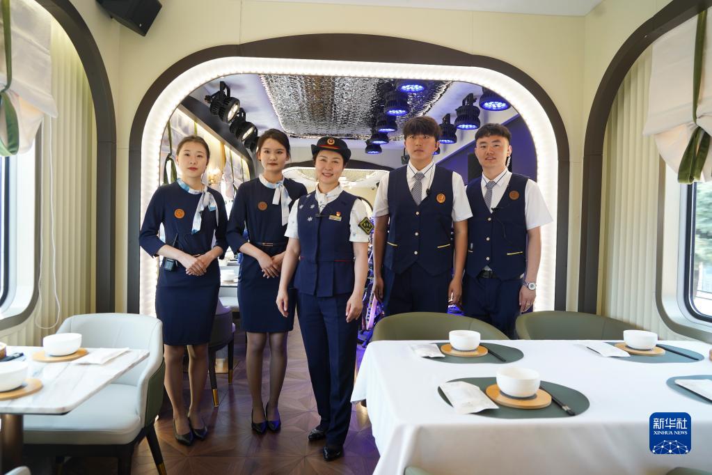 6月18日,乘务员在“林都号”旅游列车餐车车厢迎接乘客用餐。