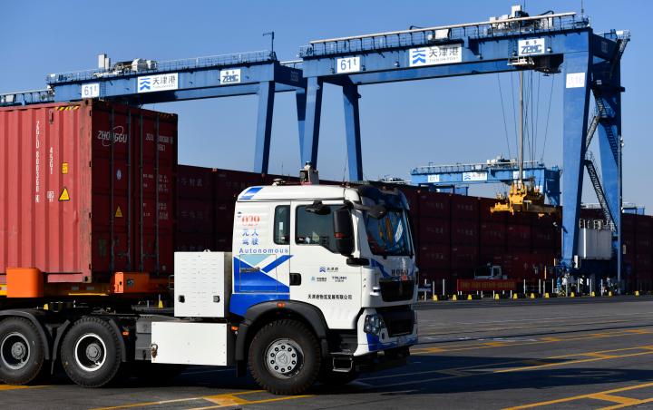 2021年1月17日,无人驾驶电动集卡在经过全流程自动化升级改造的天津港集装箱码头行驶。新华社记者 赵子硕 摄