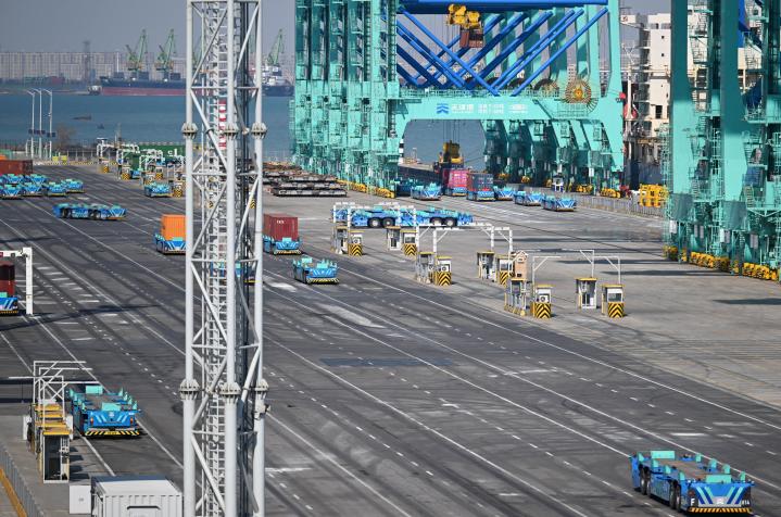 智能水平运输机器人在天津港全物联网集装箱码头作业。新华社记者 李然 摄