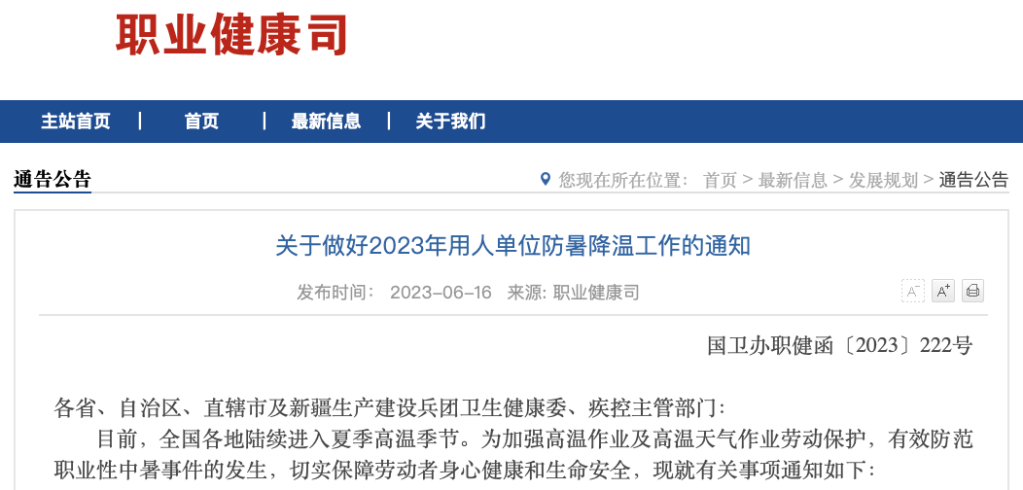通知指出,目前,全国各地陆续进入夏季高温季节。近年来,夏季高温作业及高温天气作业导致劳动者中暑死亡的事件时有发生,对劳动者身心健康和生命安全造成严重威胁。各级卫生健康行政部门和疾控主管部门要进一步明确工作责任,加强组织领导,系统谋划部署,协同推进用人单位防暑降温工作和各项职业病预防工作。