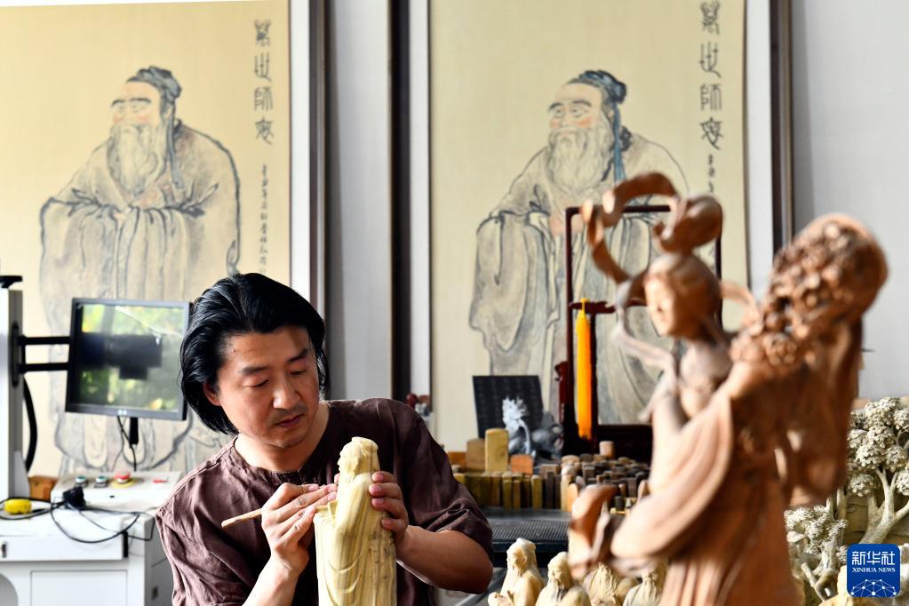 2023年6月8日,在曲阜市孔子雕像研究院,山东省工艺美术大师杜庆收在雕刻文创产品——孔子像。