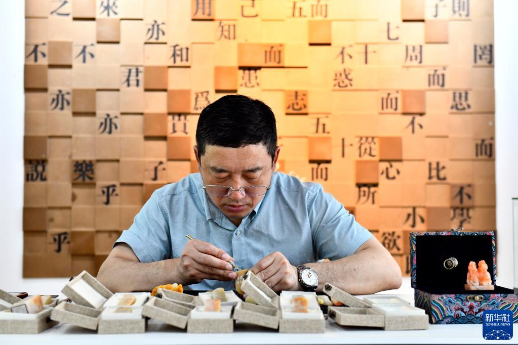 在曲阜市尼山脚下的鲁源新村文化街区,孔府印阁的工作人员在制作印章(2023年6月8日摄)。