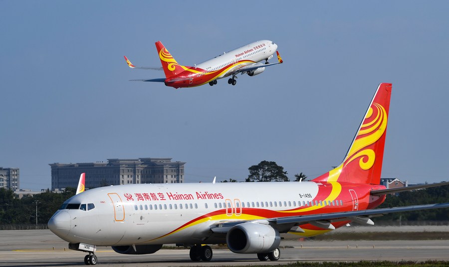 一架海南航空班机在海口美兰国际机场二期跑道起飞。(新华社记者杨冠宇摄)