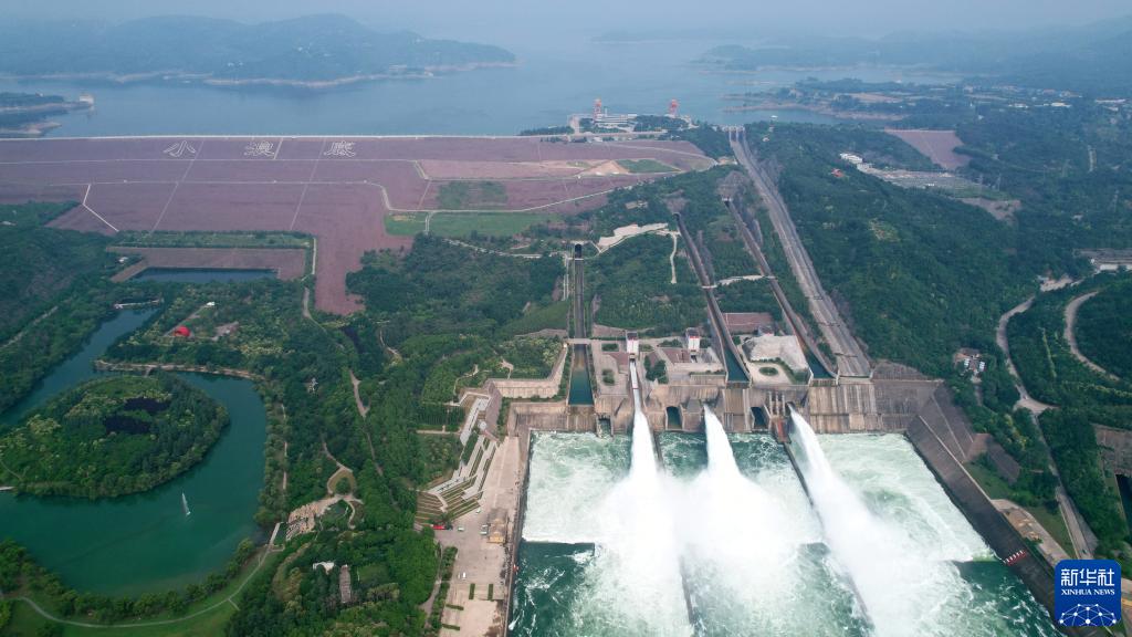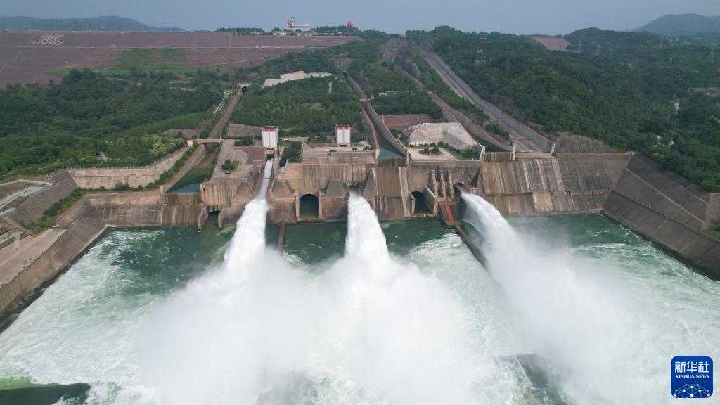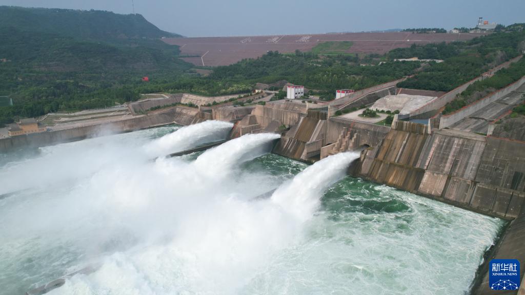 黄河小浪底水利枢纽开启3个闸门大流量下泄(6月21日摄,无人机照片)。新华社记者 刘诗平 摄