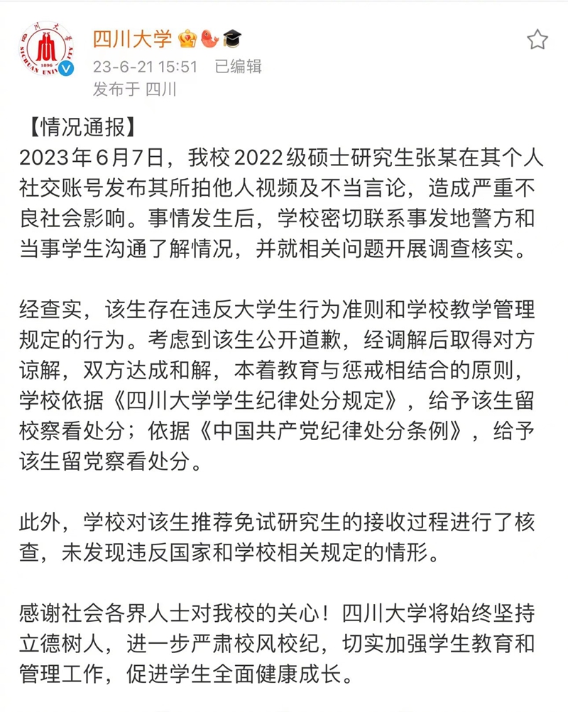 四川大学发布情况通报:2023年6月7日,我校2022级硕士研究生张某在其个人社交账号发布其所拍他人视频及不当言论,造成严重不良社会影响。事情发生后,学校密切联系事发地警方和当事学生沟通了解情况,并就相关问题开展调查核实。