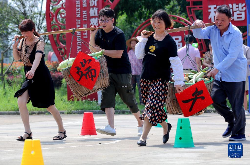 当日,浙江省湖州市长兴县和平镇长岗村开展“迎端午”农民趣味运动会,进行瓶口插秧、挑担子、独轮车运蔬菜等项目,以此方式迎接端午节。