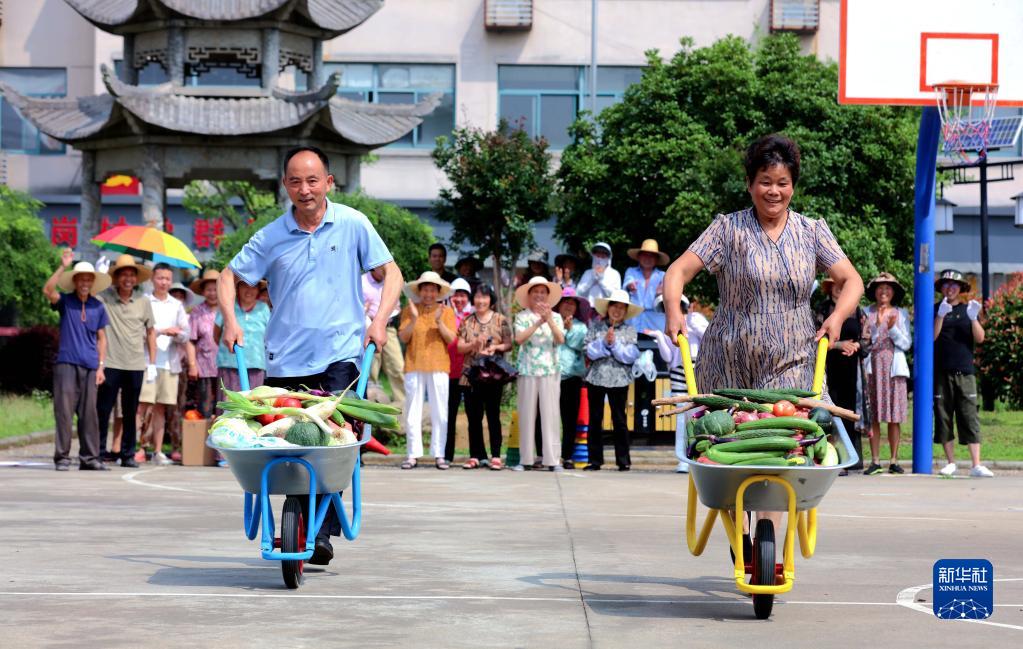 6月21日,在湖州市长兴县和平镇长岗村,村民在进行独轮车运蔬菜比赛。