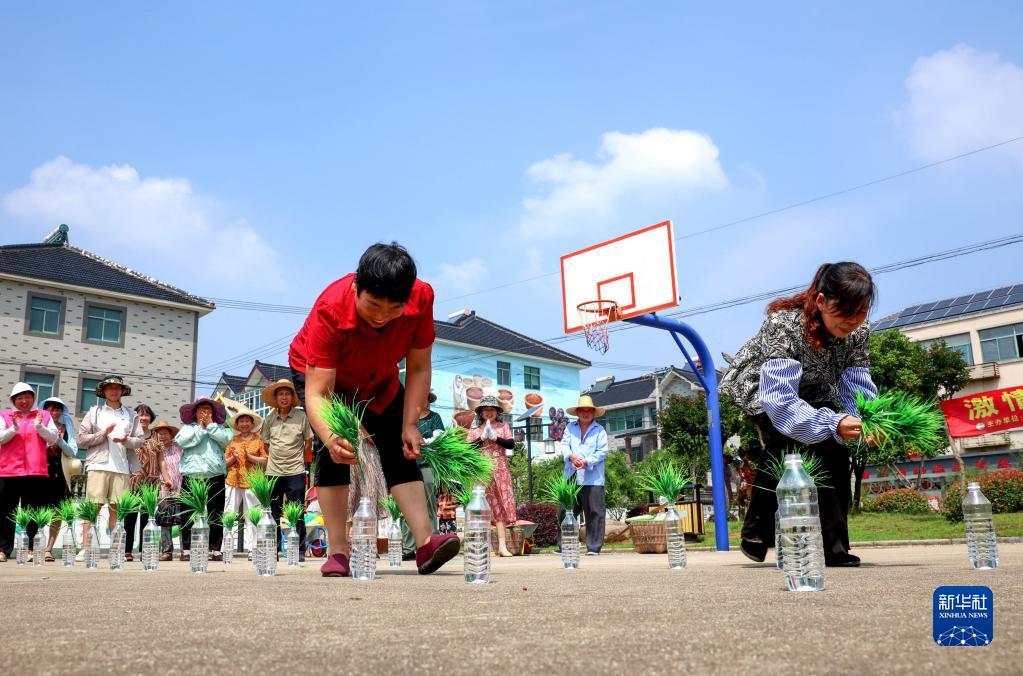 6月21日,在湖州市长兴县和平镇长岗村,村民在进行瓶口插秧比赛。