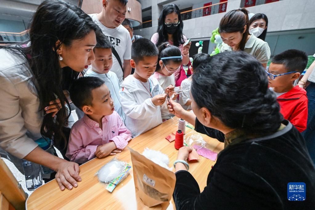 6月21日,陈玉秋在吉林市博物馆教小朋友缝制端午节香囊。