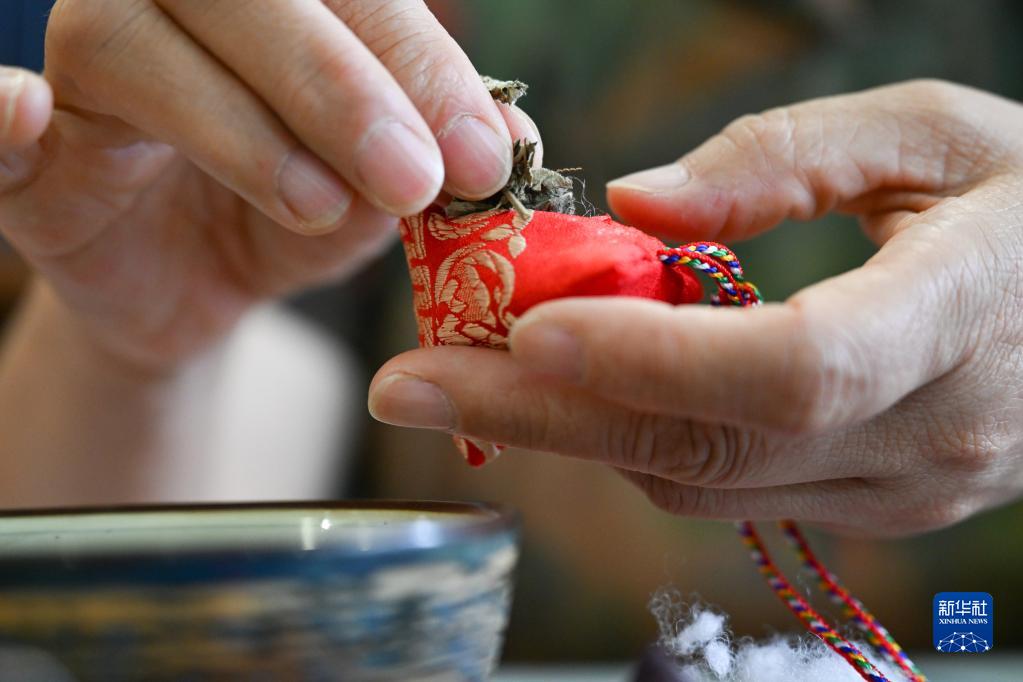 陈玉秋将艾草放入香囊中(6月20日摄)。