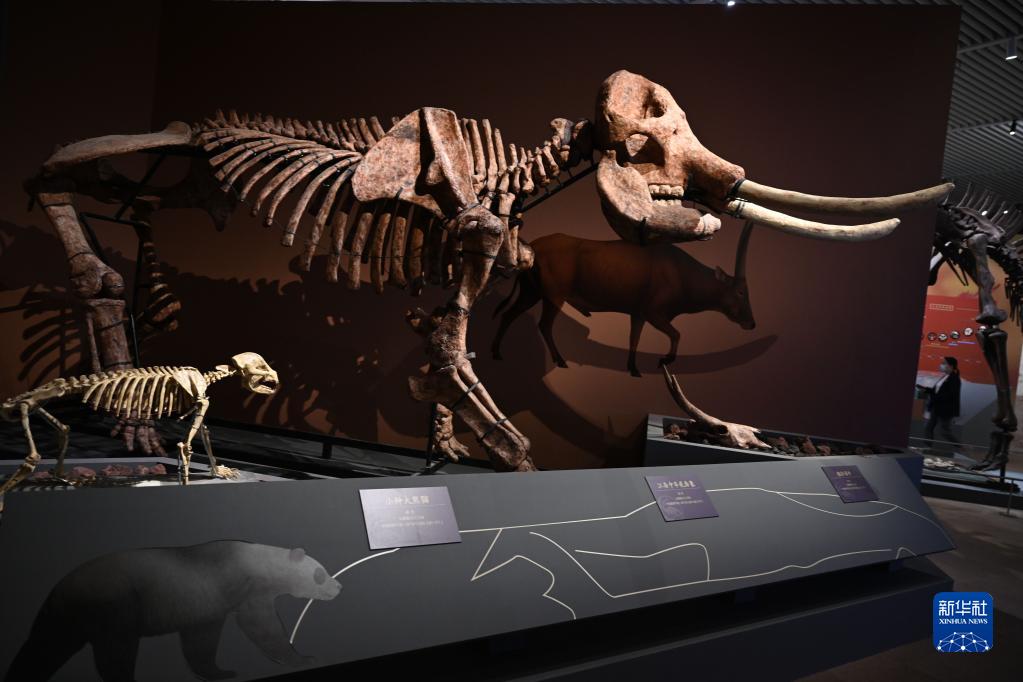6月21日在北京中国国家博物馆拍摄的江南中华乳齿象模型(上)和小种大熊猫模型。