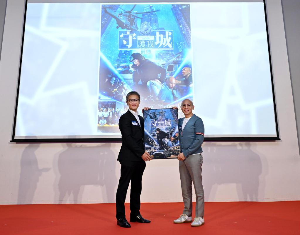 香港特区政府警务处处长萧泽颐(左)与导演林超贤(右)在该片首映礼上共同展示宣传片海报(6月20日摄)。新华社发