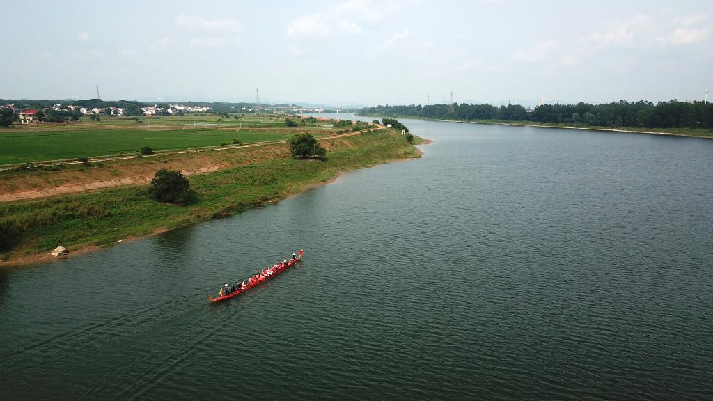 6月13日,汨罗市罗江镇汨东村龙舟队在汨罗江训练(无人机照片)。新华社记者陈振海摄