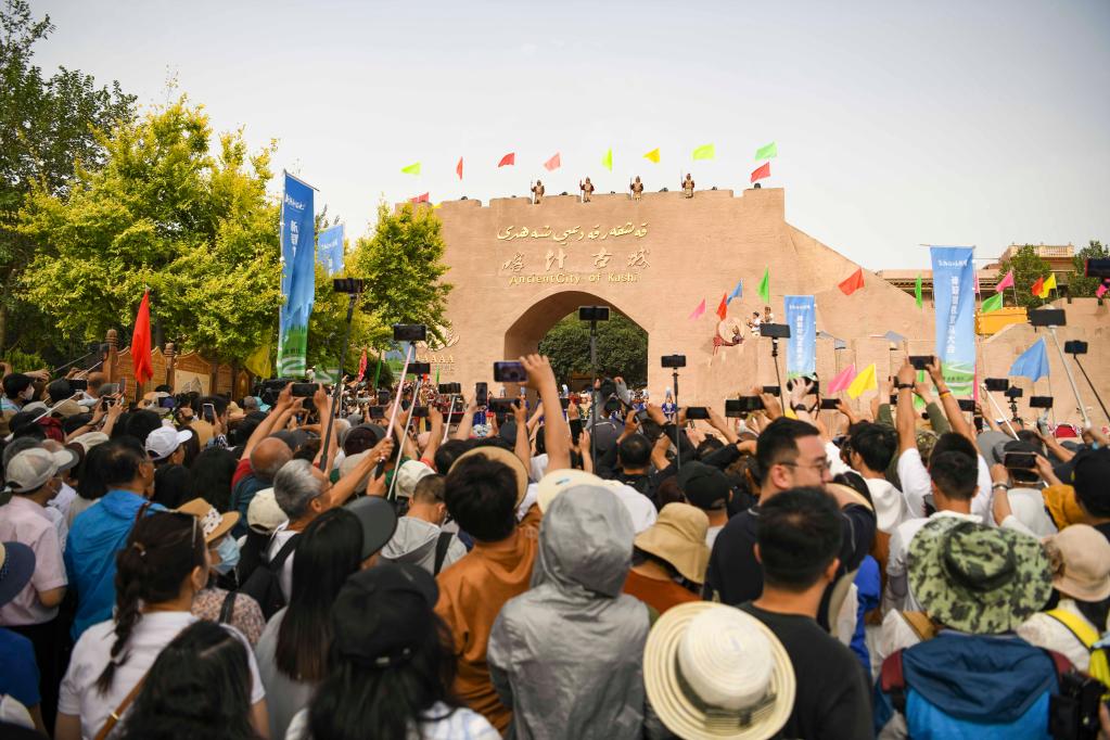 6月13日,游客在新疆喀什古城景区东门观看开城仪式表演。新华社记者胡虎虎 摄