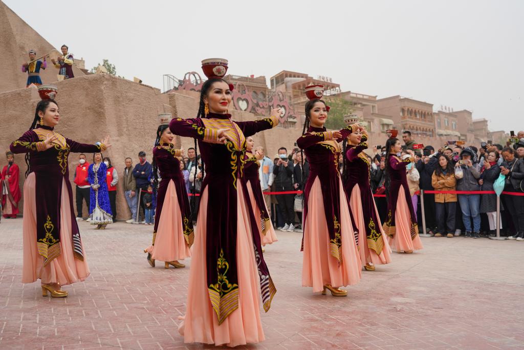 4月21日,在新疆喀什古城景区,工作人员跳起舞蹈欢迎远方来客。新华社记者丁磊 摄