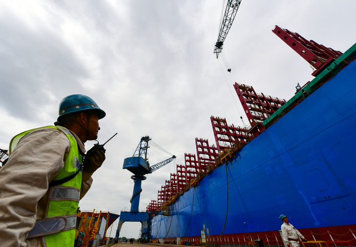 5月7日,扬州中远海运重工有限公司工人在作业。新华社发(王跃武 摄)