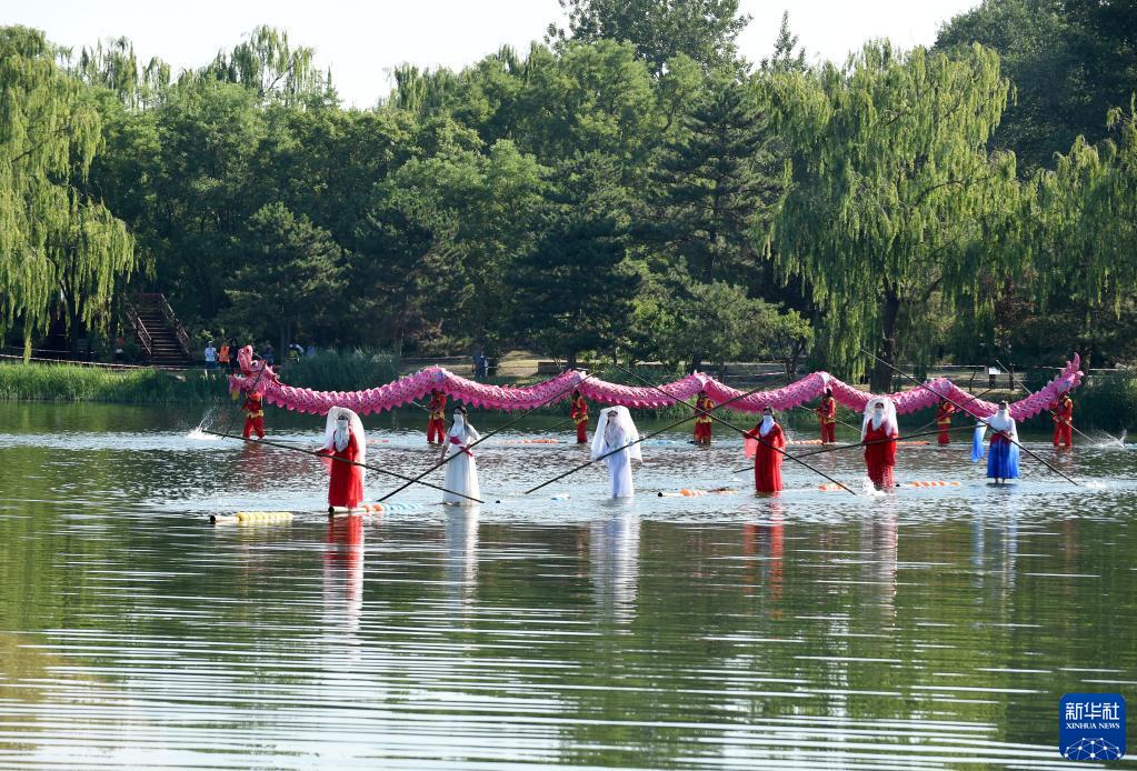6月22日,独竹漂表演者在北京圆明园九州景区的后湖进行水上表演。