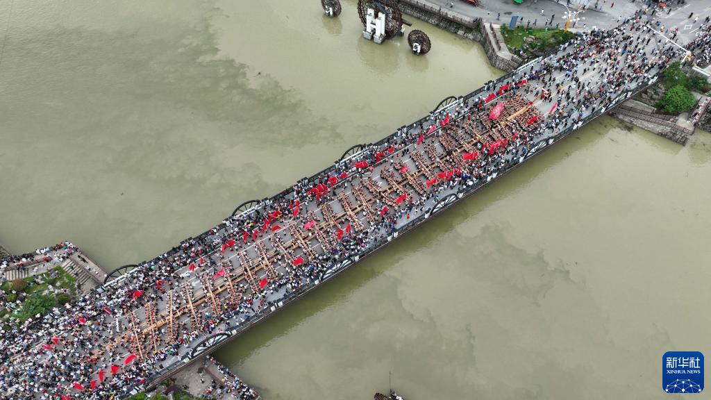 6月22日,在贵州省黔东南苗族侗族自治州施秉县举行的独木龙舟节上,人们参与独木龙舟巡游活动(无人机照片)。