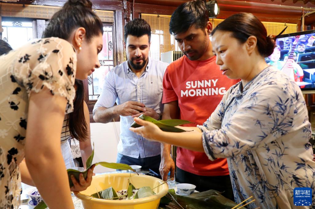 6月22日,在上海青浦朱家角古镇,留学生学习粽子的制作手法。