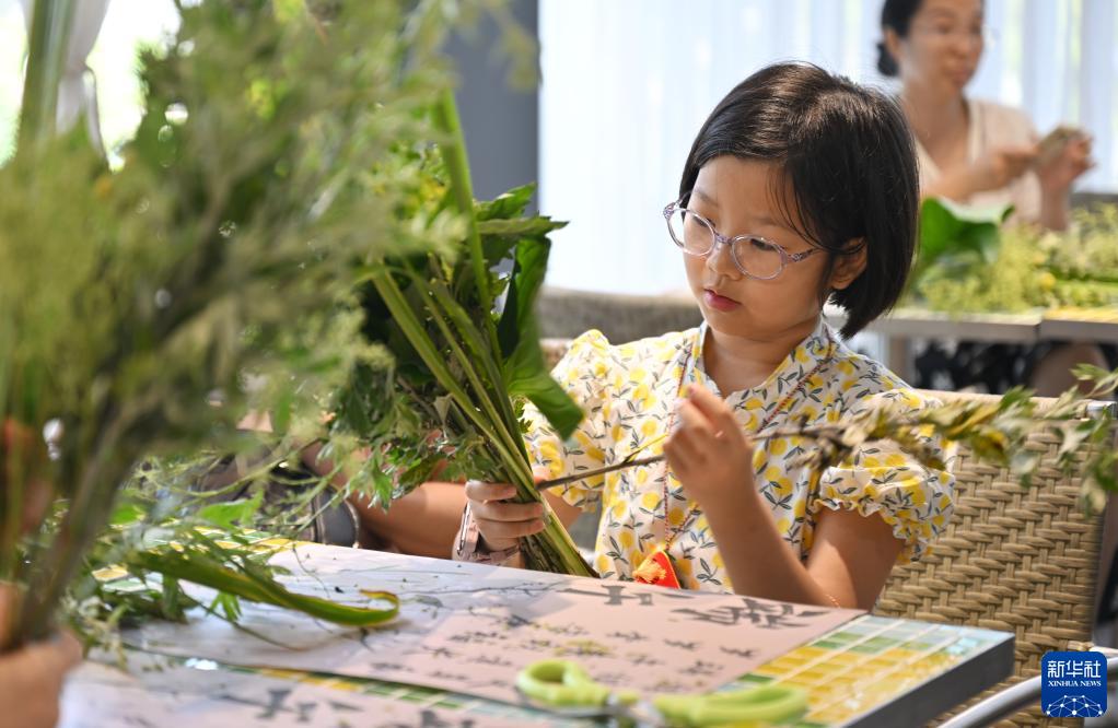 6月22日,小朋友在海南省博物馆学习制作艾草门挂。
